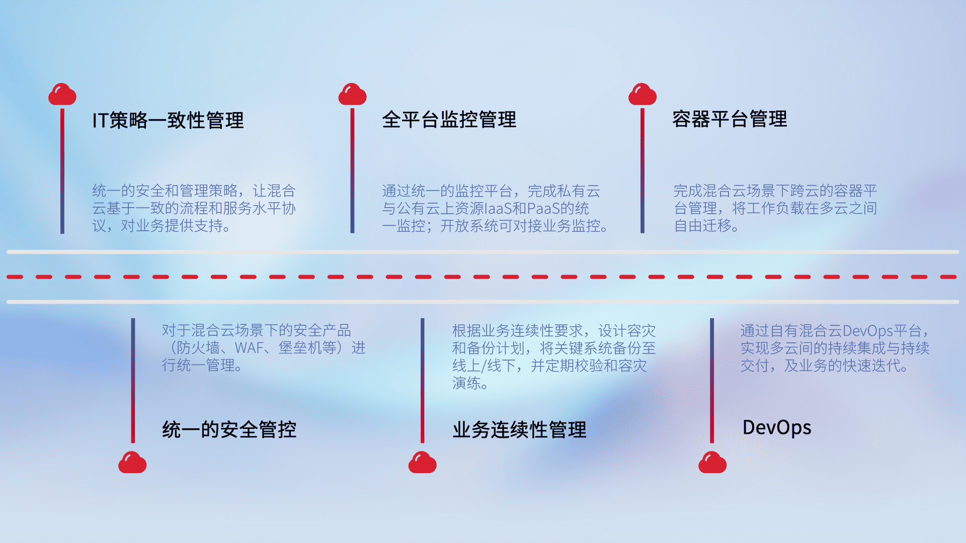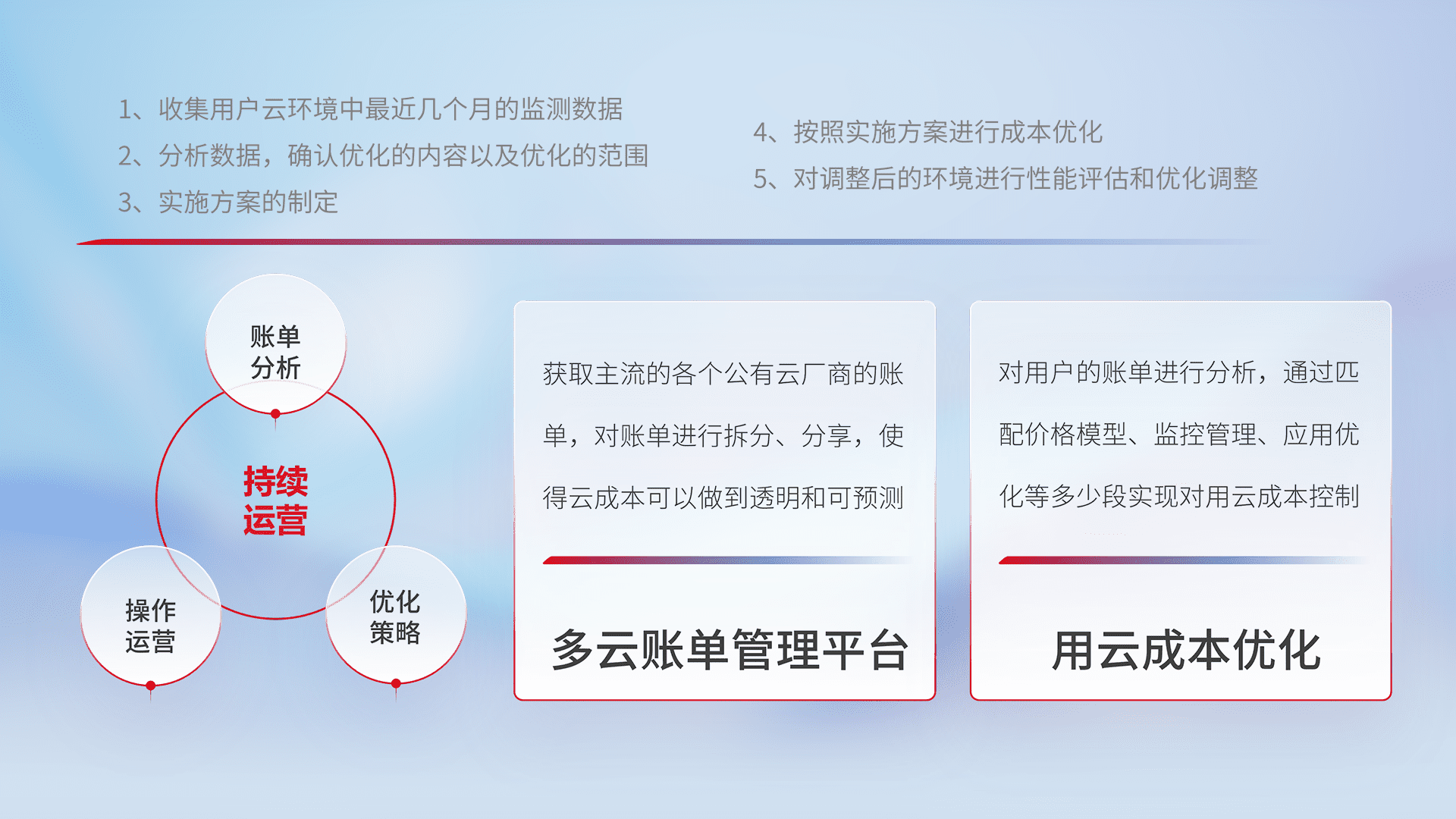 通过多云纳管,,以统一的资源数据模型把客户的云资源进行抽象和封装,,进而实现对多云资源的统一操作,,,,保障云资源管理的可靠性、、、稳定性与可用性。。。量身定制化运维内容,,,配置、、开发运维、、补丁管理、、、备份、、、监控、、认证和访问管理、、、审计和日常巡检等,,,保障在用云过程中的可靠度,,,稳定度以及高可用率。。