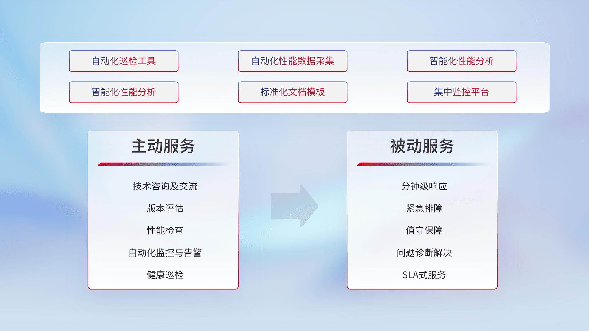 智能化工具和标准化文档,,保障服务质量,,,,提供主动服务(包含技术咨询、、、、版本评估、、、性能检查、、、自动化监控与告警、、、、健康巡检)和被动服务包含(分钟级响应、、、紧急排障、、、、值守保障、、问题诊断解决、、、SLA服务)。。